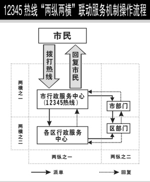為了保證熱線順利開通提供優(yōu)質(zhì)服務(wù),有關(guān)方面還建立了“兩縱兩橫”聯(lián)動服務(wù)機(jī)制。“兩縱”即市行政服務(wù)中心與各區(qū)行政服務(wù)中心之間的縱向聯(lián)系,市級熱線成員單位與區(qū)級熱線成員單位之間的縱向聯(lián)系;“兩橫”即市行政服務(wù)中心與市級熱線成員單位的橫向聯(lián)系,各區(qū)行政服務(wù)中心與區(qū)級熱線成員單位之間的橫向聯(lián)系。