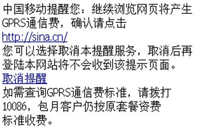 從2007年5月17日起,通過手機訪問WAP網(wǎng)站,中國移動向用戶主動提供一個收費提示頁面,提醒用戶“正在使用手機上網(wǎng)業(yè)務,若繼續(xù)瀏覽網(wǎng)頁,將會產生GPRS通信費”。但打開中國移動夢網(wǎng)頁面,則不會有上述提示。