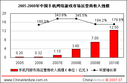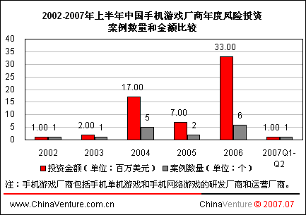 ChinaVenture分析師指出,除2006年觸通安騰和掌上明珠依靠手機網(wǎng)游業(yè)務獲得數(shù)百萬美元投資外,其余企業(yè)獲融資原因均為投資商看好手機單機游戲業(yè)務。2007年之前由于手機網(wǎng)游市場規(guī)模過小,加上無線網(wǎng)絡環(huán)境制約,風險投資商大多抱以觀望態(tài)度。