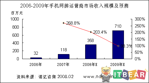 諾達(dá)咨詢報(bào)告《2008手機(jī)網(wǎng)游報(bào)告—產(chǎn)業(yè)發(fā)展與競(jìng)爭(zhēng)策略》認(rèn)為,手機(jī)網(wǎng)絡(luò)游戲已經(jīng)過了市場(chǎng)導(dǎo)入期,在未來幾年將步入快速發(fā)展階段。咨詢研究數(shù)據(jù)表明,2007年手機(jī)網(wǎng)游市場(chǎng)運(yùn)營(yíng)收入達(dá)到了1.18億元人民幣,今年將達(dá)3.58億元人民幣,到2009年市場(chǎng)規(guī)模有望突破7.0億元人民幣。