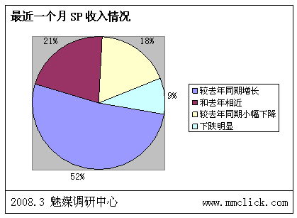 最近公布的空中網(wǎng)財(cái)務(wù)報(bào)表的數(shù)據(jù)顯示空中網(wǎng)總收入環(huán)比增長(zhǎng),結(jié)合之前廣東移動(dòng)推出:廣東移動(dòng)向重服務(wù)轉(zhuǎn)變 首推“6+1”服務(wù),SP行業(yè)可以說是暖風(fēng)頻吹。魅媒無線行業(yè)調(diào)研中心隨機(jī)從3月3日到3月5日隨記電話采訪50多家全網(wǎng)以及廣東省網(wǎng)SP公司相關(guān)負(fù)責(zé)人,對(duì)最近的SP行業(yè)的政策調(diào)整進(jìn)行調(diào)查,有以下的數(shù)據(jù):