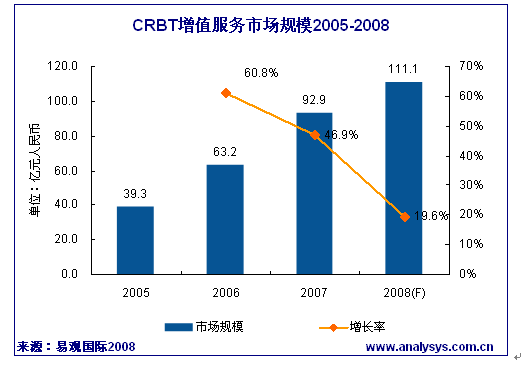 2007年中國CRBT市場(chǎng)規(guī)模達(dá)92.9億,保持較為高速的增長勢(shì)頭。