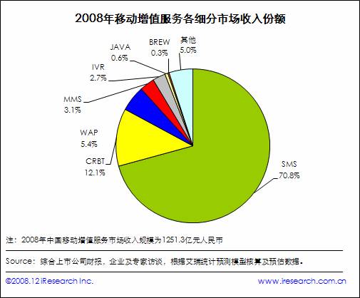 艾瑞研究發(fā)現(xiàn),2008年移動增值服務細分市場收入中SMS以70.8%的比例占據主導地位,但其他業(yè)務對SMS的分流和替代使其增長率有所下降;CRBT、WAP分別以12.1%和5.4%的比例位居第二、第三。