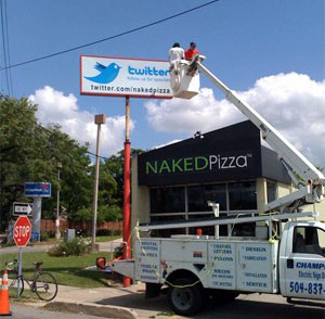 繼華爾街日報、紐約時報、英國衛(wèi)報等報紙利用起Twitter后,最近,據(jù)Techcrunch網(wǎng)站消息稱,美國新奧爾良名為NakedPizza的比薩店,不僅在Twitter上注冊了帳號,而且拆除了之前標有訂餐電話的店前廣告牌,取而代之的是一塊以Twitter為主題的新廣告牌。