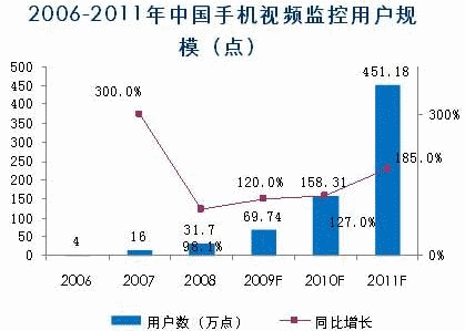 諾達咨詢預(yù)測,2006年中國手機監(jiān)控用戶以4萬點計算,2009年隨著運營商3G網(wǎng)絡(luò)建設(shè)和3G業(yè)務(wù)的推進,用戶數(shù)將有大幅度增長,2010年用戶將達到158.31萬點,2011年達到451.18萬點。
