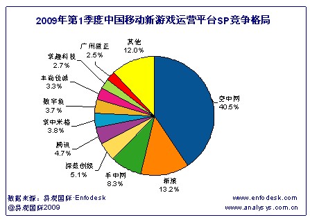 據(jù)易觀國(guó)際Enfodesk產(chǎn)業(yè)數(shù)據(jù)庫(kù)中《2009年第2季度中國(guó)手機(jī)游戲市場(chǎng)季度監(jiān)測(cè)》顯示:2009年第1季度中國(guó)移動(dòng)的手機(jī)游戲服務(wù)信息費(fèi)收入達(dá)1.86億人民幣,其中中國(guó)移動(dòng)新游戲運(yùn)營(yíng)管理平臺(tái)的信息費(fèi)收入占總體收入的12.41%,達(dá)2310萬(wàn)元人民幣。