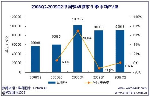 而對于中國移動搜索引擎的PV進行統(tǒng)計發(fā)現(xiàn):2009年第2季度中國移動搜索因此市場日均PV量達9.09億次,環(huán)比增長0.6%,相比去年同期增長60%。而2009年隨著總體搜索量的增長PV量不增反減,主要歸因于搜索精確度的大大提升減少用戶單次搜索請求所帶來的PV量,另一方面用戶對網(wǎng)頁之外的音樂、圖片、軟件等內(nèi)容的搜索請求數(shù)增多,但此類內(nèi)容的單次搜索所帶來的PV明顯小于網(wǎng)頁搜索所帶來的PV。