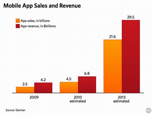 美國市場研究公司Gartner的最新數(shù)據(jù)顯示,2009年全球手機應(yīng)用銷售額高達42億美元。以銷量計算,蘋果占據(jù)99.4%的市場份額。