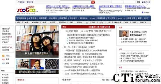 CTI論壇(ctiforum)1月11日消息(記者 張塵):近日,記者獲悉,原天極傳媒集團(tuán)副總裁、資深媒體人士范鋒正式宣布創(chuàng)業(yè),同時(shí),其所創(chuàng)辦的Web2.0媒體速途網(wǎng)(www.sootoo.com)于今日正式上線。在經(jīng)過近9個(gè)月的低調(diào)測(cè)試之后,定位于“中國(guó)互聯(lián)網(wǎng)行業(yè)媒體和在線服務(wù)平臺(tái)”的速途網(wǎng)今天以全新版式亮相。