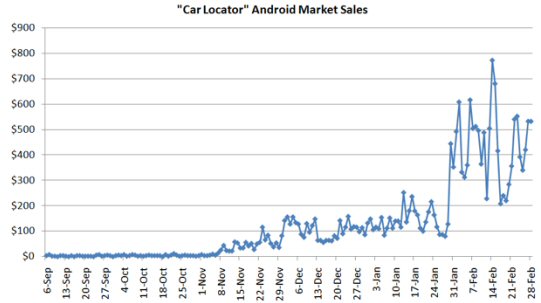 在被Android應(yīng)用商店列為特別應(yīng)用前,“汽車定位器”每天獲得的收入約為80至100美元。此后,其銷售額便大幅增加,平均每天達(dá)到435美元,情人節(jié)那天更是達(dá)到創(chuàng)紀(jì)錄的772美元。