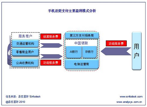 根據(jù)Enfodesk易觀智庫(kù)近期發(fā)布的《中國(guó)手機(jī)支付市場(chǎng)系列專(zhuān)題報(bào)告2010——近距支付》報(bào)告顯示,手機(jī)近距支付的主要盈利模式只有三種:即前向用戶服務(wù)費(fèi)、結(jié)算手續(xù)費(fèi)和后向商戶服務(wù)費(fèi)。