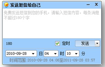 迷你飛信1.0 beta版另一大亮點(diǎn)就是類似于“移動(dòng)小秘書(shū)”的自我短信定時(shí)發(fā)送功能。用戶只需直接在好友列表或使用快捷鍵“Ctrl+Alt+W”,就打開(kāi)了給自己發(fā)送定時(shí)短信的窗口。這一功能將滿足用戶通過(guò)飛信進(jìn)行“短信提醒”的使用需求。