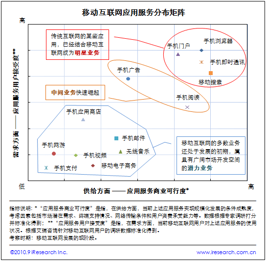 根據(jù)艾瑞咨詢近期發(fā)布的《2009-2010年中國(guó)移動(dòng)互聯(lián)網(wǎng)行業(yè)發(fā)展報(bào)告》,移動(dòng)互聯(lián)網(wǎng)各應(yīng)用服務(wù)在“應(yīng)用服務(wù)商業(yè)可行度”和“應(yīng)用服務(wù)用戶接受度”兩個(gè)維度上被劃分為“明星業(yè)務(wù)”、“中間業(yè)務(wù)”和“潛力業(yè)務(wù)”三個(gè)類型。具備一定規(guī);l(fā)展市場(chǎng)條件,但還面臨若干限制因素的移動(dòng)互聯(lián)網(wǎng)業(yè)務(wù),將在未來(lái)逐步打開市場(chǎng)。