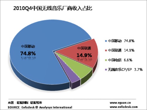 根據(jù)Enfodesk易觀智庫(kù)最新發(fā)布的數(shù)據(jù)顯示,2010年第4季度中國(guó)無(wú)線音樂(lè)收入保持穩(wěn)定的增長(zhǎng),達(dá)到74.13億元,環(huán)比增長(zhǎng)4.58%。