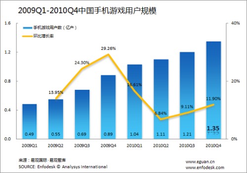 另外,從手機(jī)游戲用戶規(guī)模來(lái)看,2010年第4季度中國(guó)手機(jī)游戲用戶數(shù)量達(dá)到了1.35億,環(huán)比增長(zhǎng)11.9%。