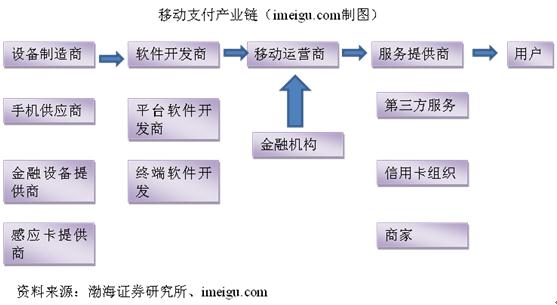 移動支付業(yè)務產業(yè)鏈主體由設備制造商、銀行、信用卡組織、移動運營商、移動支付服務提供商(或移動支付平臺運營商)、商業(yè)機構、SIM卡供應商、手機供應商、用戶等多個環(huán)節(jié)組成。
