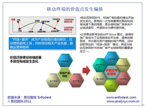 易觀智庫Enfodesk在近期發(fā)布《中國移動(dòng)互聯(lián)網(wǎng)市場年度綜合報(bào)告2011》中認(rèn)為,隨著3G的普及以及多元化移動(dòng)應(yīng)用的出現(xiàn),智能手機(jī)取代功能手機(jī)已成定勢,導(dǎo)致傳統(tǒng)的移動(dòng)終端價(jià)值點(diǎn)開始由產(chǎn)品化向服務(wù)化遷移。終端廠商原有模式也受到極大挑戰(zhàn)。若不進(jìn)行有效轉(zhuǎn)型恐難以在未來2-3年后的手機(jī)市場生存。