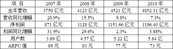 中國移動(dòng)2007年-2010年年度業(yè)績(jī)對(duì)比