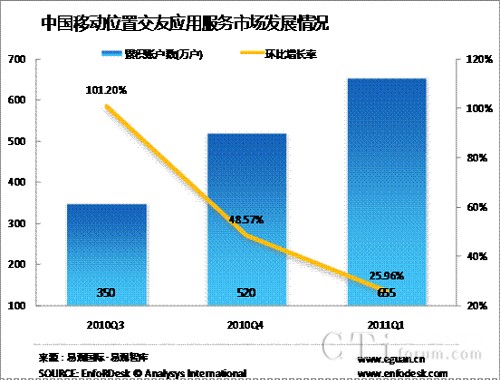 2011年Q1中國移動位置交友應(yīng)用累計(jì)帳戶數(shù)達(dá)655萬