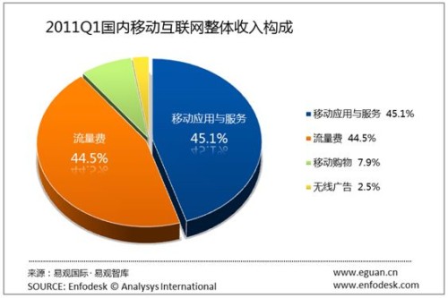 從2011年第1季度移動互聯(lián)網(wǎng)收入構(gòu)成,我們發(fā)現(xiàn)移動應(yīng)用與服務(wù)仍然是主要營收,占總體市場的45.13%。而流量費依然占據(jù)44.45%的份額。而移動購物,無線廣告營收占比增長有限,分別占7.89%和2.52%。