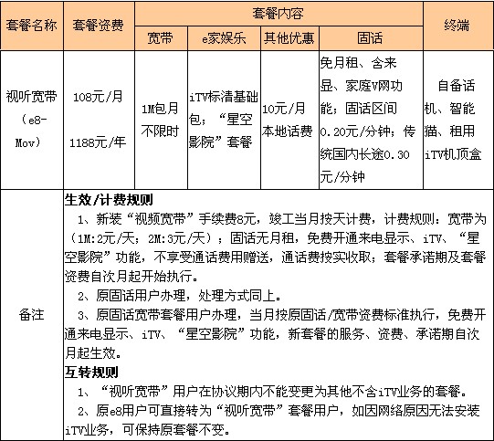尊享e8套餐適用于對(duì)家庭上網(wǎng)時(shí)長(zhǎng)及速度要求很高,固話使用量較大,有iTV需求的家庭客戶(hù),分為168/月和208元/月兩檔。