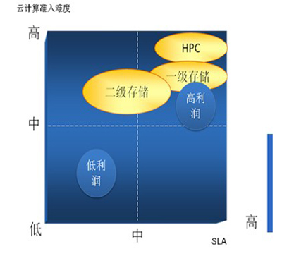 從企業(yè)戰(zhàn)略咨詢分析師的角度,我認(rèn)為IBM的戰(zhàn)略布局和資源整合策略確實是IT領(lǐng)域戰(zhàn)略規(guī)劃很好的教科書(起碼對于我個人而言)。精準(zhǔn)的定位市場、以具有明顯技術(shù)細(xì)分優(yōu)勢的產(chǎn)品或服務(wù)切入市場、設(shè)定較高的技術(shù)準(zhǔn)入門檻,這些戰(zhàn)略舉措不僅有助于IBM快速占領(lǐng)新生市場戰(zhàn)略制高點,同時保證了其可持續(xù)競爭優(yōu)勢和利潤空間。從下面的云計算準(zhǔn)入/云服務(wù)SLA象限圖上,當(dāng)很多廠商還在考慮“哪塊云彩有雨”時,IBM已經(jīng)完成在云端提供HPC和高增值二級存儲服務(wù)的布局,掌控了利潤最豐厚的云計算高端市場。從我個人的預(yù)測,IBM在云端提供一級存儲服務(wù),應(yīng)該是其云計算高端戰(zhàn)略的下一個布局。