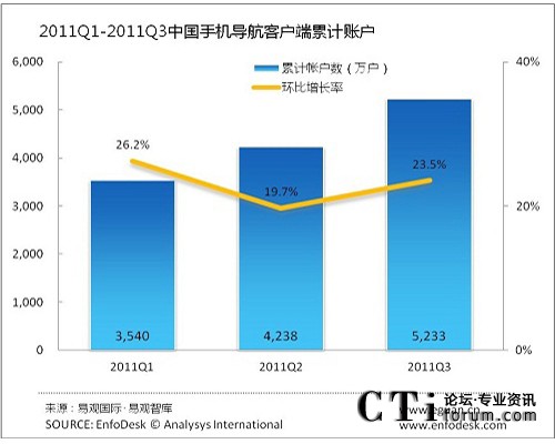 根據(jù)EnfoDesk易觀智庫(kù)最新發(fā)布的數(shù)據(jù)顯示,截止2011年9月底,中國(guó)手機(jī)導(dǎo)航客戶端累積賬戶數(shù)為5233萬(wàn),相比2011年第2季度的4238萬(wàn),環(huán)比增長(zhǎng)23.5%。