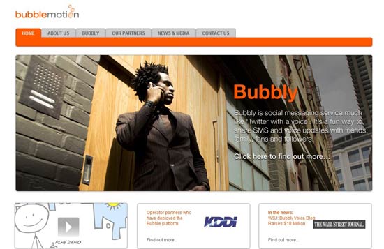 “Bubble Motion”的Bubbly平臺是一個手機端的語音微博服務,允許用戶通過聲音向他們的關注者和粉絲發(fā)布狀態(tài)信息,模式與Twitter一樣,只是將文字變成了聲音,微博變成了bubbles,用戶將錄制的聲音更新到手機,然后所有粉絲將收到一條短信通知,點擊短信內的鏈接就可以收聽。