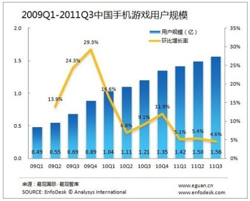 根據(jù)EnfoDesk易觀智庫產(chǎn)業(yè)數(shù)據(jù)庫最新發(fā)布的《2011年第3季度中國手機(jī)游戲市場季度監(jiān)測》數(shù)據(jù)顯示,中國手機(jī)游戲用戶規(guī)模穩(wěn)步增長,截止2011年第3季度達(dá)1.56億,環(huán)比增長4.6%。