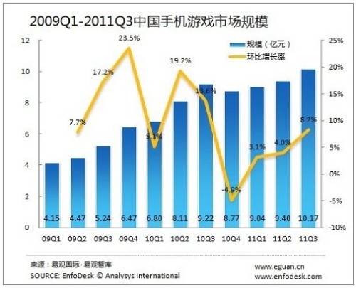 另外,從手機(jī)游戲市場規(guī)模來看,2011年第3季度手機(jī)游戲市場規(guī)模一舉突破10億大關(guān),達(dá)到10.17億,環(huán)比增長8.2%。