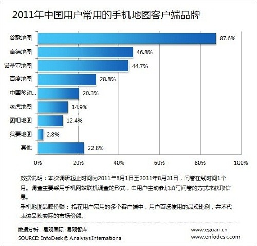 CTI論壇(ctiforum)11月25日消息(記者 潘婷婷): 據(jù)EnfoDesk易觀智庫(kù)最新發(fā)布的《2011中國(guó)手機(jī)地圖導(dǎo)航用戶調(diào)研報(bào)告》顯示,谷歌地圖、高德地圖及諾基亞地圖分別以87.6%、46.8%及44.7%的份額,占據(jù)2011年用戶最常用的手機(jī)地圖客戶端品牌份額(指在用戶常用的多個(gè)客戶端中,用戶首選使用的品牌比例,并不代表該品牌實(shí)際的市場(chǎng)份額,實(shí)際市場(chǎng)份額參見《2011年第3季度中國(guó)手機(jī)地圖客戶端市場(chǎng)監(jiān)測(cè)報(bào)告》)前三名的位置。