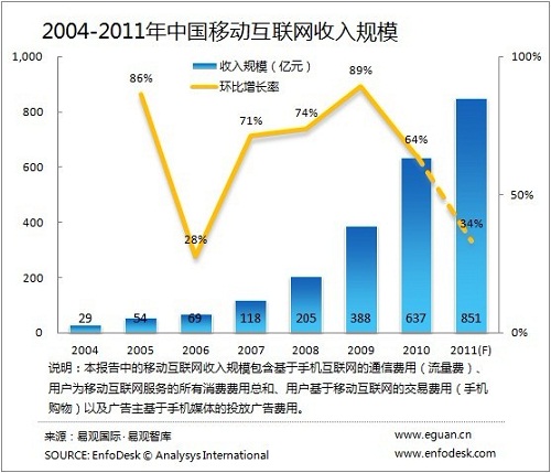 2011年中國移動互聯(lián)網(wǎng)市場規(guī)模達(dá)851億