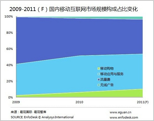 對比2009年到2011年市場規(guī)模的構(gòu)成變化可以了解到,2011年移動購物與無線廣告在規(guī)模占比上都有了很大的提高,尤其是移動購物,從2009年的規(guī)模占比3%增長到11%,用戶對通過移動終端購物的習(xí)慣整逐步被得到培養(yǎng),另外值得注意的是2011年移動互聯(lián)網(wǎng)流量費(fèi)占比低于50%,已經(jīng)從2009的58%減少至42%。