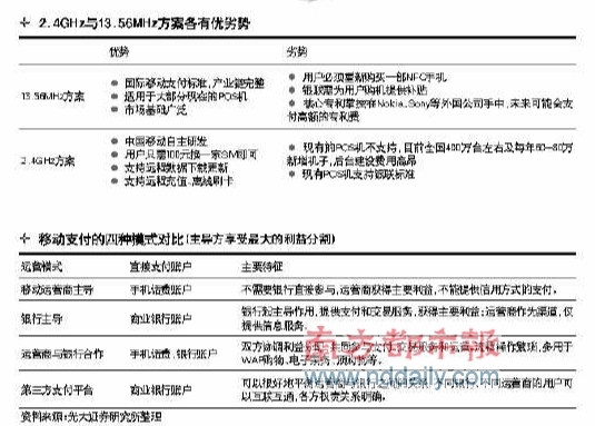 對(duì)此,國(guó)金證券發(fā)布了一份研究報(bào)告稱(chēng),相對(duì)于13 .56MHz方案而言,2.4GHz方案在推廣上有先天的優(yōu)勢(shì)。畢竟13.56M H z方案必須對(duì)手機(jī)重新設(shè)計(jì),需要等待手機(jī)產(chǎn)業(yè)鏈對(duì)13.56M H z的逐步支持,時(shí)間周期較長(zhǎng);同時(shí),更換13.56M H z手機(jī)帶來(lái)的重置成本無(wú)論是由用戶承擔(dān)還是由運(yùn)營(yíng)商承擔(dān)都是一筆高額的費(fèi)用,推廣難度較高。而2.4G H z方案僅需更換SIM卡便可完成對(duì)手機(jī)的改造,不用等待終端產(chǎn)業(yè)鏈的成熟;同時(shí)改造成本低,便于運(yùn)營(yíng)商進(jìn)行促銷(xiāo)推廣。