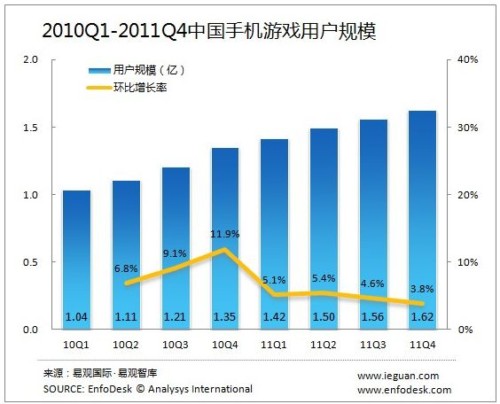 CTI論壇(ctiforum)2月27消息(記者 潘婷婷): 根據(jù)EnfoDesk易觀智庫產(chǎn)業(yè)數(shù)據(jù)庫最新發(fā)布的《2011年第4季度中國手機游戲市場季度監(jiān)測》數(shù)據(jù)顯示,中國手機游戲用戶規(guī)模穩(wěn)步增長,截止2011年第4季度達1.62億,環(huán)比增長3.83%。