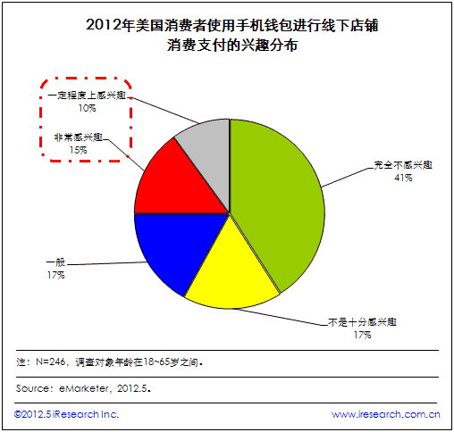 iResearch艾瑞咨詢整理eMarketer調(diào)查數(shù)據(jù)發(fā)現(xiàn),盡管手機(jī)支付市場增速迅猛,但其在美國消費(fèi)者中的接受程度相對較低。數(shù)據(jù)顯示,被調(diào)查者中只有1/4的美國用戶對使用手機(jī)錢包在線下店鋪消費(fèi)感興趣,而相比之下,58%的消費(fèi)者對手機(jī)錢包技術(shù)不感興趣,其中包括41%的人完全沒興趣。