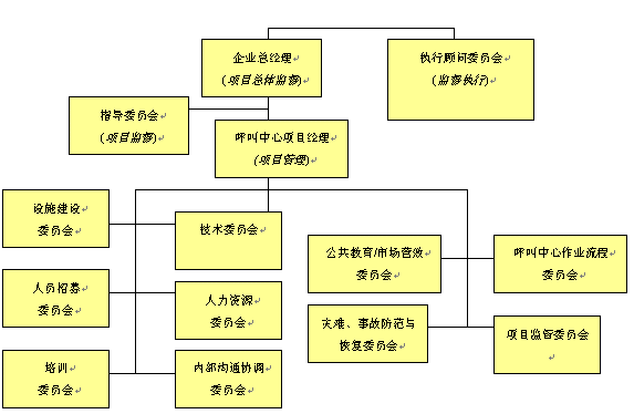 。。對(duì)于呼叫中心建設(shè)項(xiàng)目實(shí)施的規(guī)劃是一個(gè)需要付出巨大心血與努力的階段,這個(gè)階段需要企業(yè)或組織機(jī)構(gòu)所有人員的廣泛參與和專家意見。對(duì)于呼叫中心運(yùn)營(yíng)的規(guī)劃,相對(duì)與呼叫中心建設(shè)項(xiàng)目而言則顯得有些"特殊",它意味著整個(gè)呼叫中心建設(shè)項(xiàng)目團(tuán)隊(duì)不可能有全部的時(shí)間花費(fèi)在運(yùn)營(yíng)規(guī)劃議題上。因此,我們可以將全部項(xiàng)目規(guī)劃工作與任務(wù)拆分成若干個(gè)規(guī)劃細(xì)項(xiàng),這將保證有較強(qiáng)的可操作性。我們建議采取的方式是將整個(gè)項(xiàng)目實(shí)施規(guī)劃團(tuán)隊(duì)拆分成負(fù)責(zé)各個(gè)專項(xiàng)實(shí)施的小組委員會(huì)或附屬委員會(huì)。這些小組委員會(huì)將集中關(guān)注各自特定的項(xiàng)目實(shí)施上,當(dāng)有需要時(shí),與其他各小組進(jìn)行交流與溝通,并在相關(guān)問(wèn)題上達(dá)成一致。按照以上項(xiàng)目組織管理架構(gòu)其目的是,在項(xiàng)目實(shí)施的關(guān)鍵環(huán)節(jié)和領(lǐng)域,能產(chǎn)生出更具深度的規(guī)劃方案。這樣操作同時(shí)可以使更多的人員參與進(jìn)來(lái),并有利于增強(qiáng)各個(gè)小組的責(zé)任感,有助于項(xiàng)目的成功實(shí)施。以下的項(xiàng)目指導(dǎo)委員會(huì)組織架構(gòu)不是任何呼叫中心建設(shè)項(xiàng)目都能適用的,但是它在某種程度上已經(jīng)為呼叫中心項(xiàng)目規(guī)劃提出了一個(gè)基本方針,按照這個(gè)思路它將保證項(xiàng)目的成功實(shí)施。而對(duì)于規(guī)模較小的呼叫中心項(xiàng)目,以上的組織架構(gòu)成員將扮演多重角色,并負(fù)責(zé)多項(xiàng)任務(wù)項(xiàng)目的實(shí)施。就呼叫中心項(xiàng)目規(guī)劃與實(shí)施團(tuán)隊(duì)而言,應(yīng)由若干個(gè)負(fù)責(zé)不同領(lǐng)域?qū)嵤┑男〗M來(lái)組成,以便確保呼叫中心建設(shè)項(xiàng)目的所有領(lǐng)域,及各個(gè)階段的有效實(shí)施。呼叫中心項(xiàng)目規(guī)劃與實(shí)施組織架構(gòu)請(qǐng)見下圖。