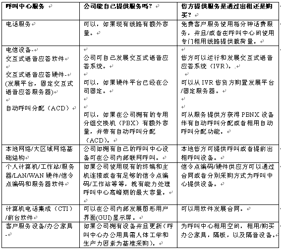 。。一旦決定從事呼叫中心業(yè)務(wù),公司必須確定要從外部售貨方購買的服務(wù)與設(shè)備的范圍。公司政策和經(jīng)營法則會指示其應(yīng)遵循什么程序進(jìn)行這一過程。也可能會是一些合同,它們可以使公司能夠快速地完成這些步驟。