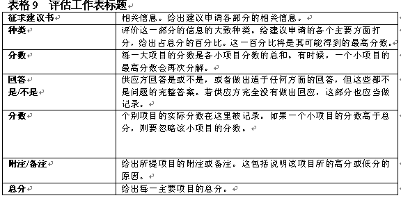 建議申請?jiān)u估工作表有助于資源選擇工作組客觀地對承包商建議進(jìn)行評價。這一過程包括在總分基礎(chǔ)上給各個方面評分。表格8舉出了一個具體的評分表表格9包含了對工作表標(biāo)題的解說。