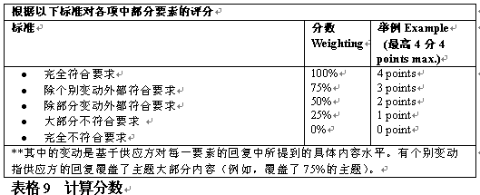 。。評分者應(yīng)該了解供應(yīng)方對所提建議申請的回復(fù),從各方面評估該建議符合每一評判標(biāo)準(zhǔn)的情況,相應(yīng)地給出分?jǐn)?shù)。根據(jù)每個標(biāo)準(zhǔn),應(yīng)在評判過程中分組給出最高分?jǐn)?shù)。表格9舉例說明了如何對回復(fù)打分。.
