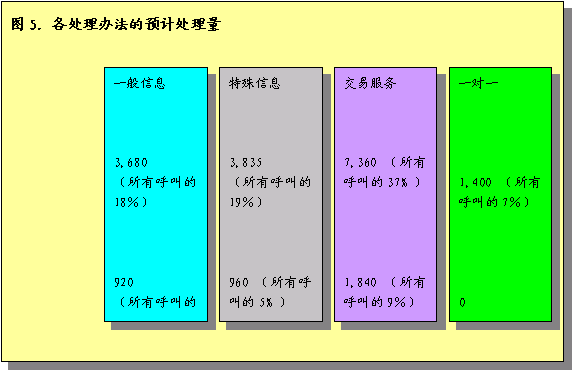 根據(jù)預(yù)計(jì)呼叫量的分析,估計(jì)人工代表將處理16300個(gè)呼叫,IVR將處理余下的3700個(gè)呼叫。圖5圖示了各呼叫處理辦法預(yù)計(jì)處理的呼叫量。