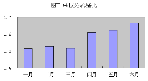 圖一到圖三中我們可以看到來電總量從一季到下一季度增加了15%。從前一季度開始到后一季度結(jié)束設(shè)備總量增加了8%。每月平均來話/設(shè)備比在六個月中從1.5增強(qiáng)到1.7。