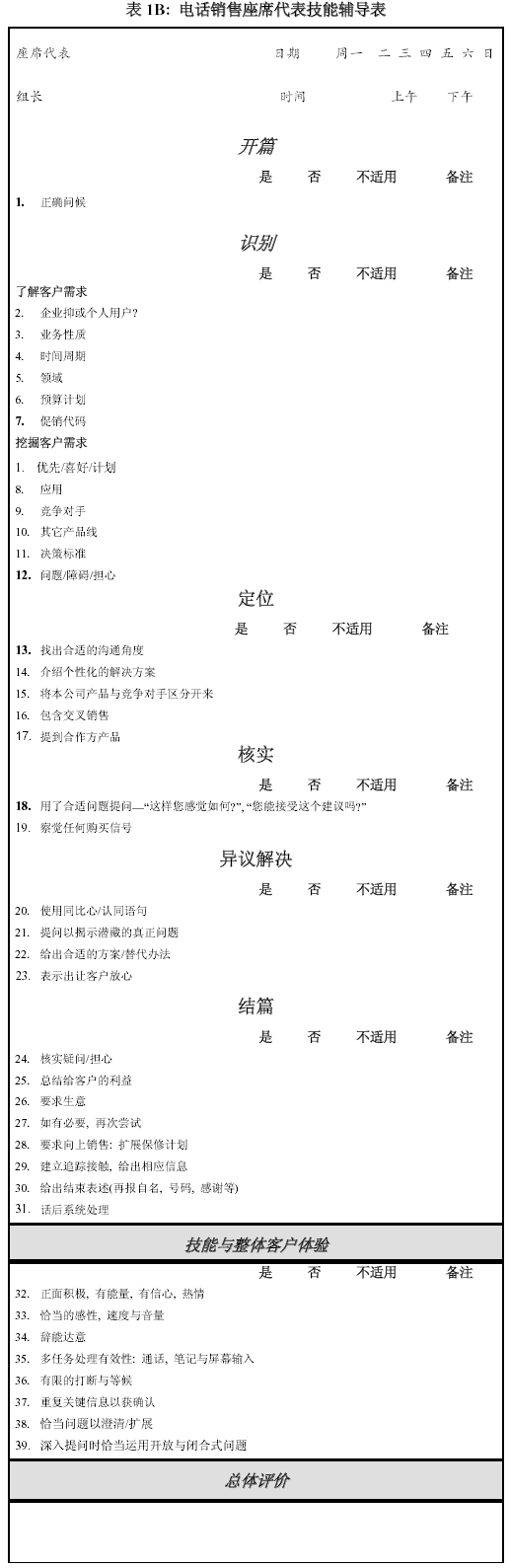 。。以上的表格主要是給從事客戶服務(wù)的座席代表使用,以下的表格是根據(jù)我自己使用過的對具電話營銷功能的座席代表輔導(dǎo)表改動而來。