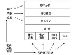 真正的CRM解決方案是一個復雜的聯(lián)合體,它由許多組件(即分析工具、活動管理與事件引發(fā)等)與許多需要用來達到一對一的營銷能力(如間接管理、基于規(guī)章制度的工作流管理以及真正的渠道管理等)的新組件共同組成。此外,在非客戶聯(lián)系系統(tǒng)(如企業(yè)資源規(guī)劃與操作)與客戶聯(lián)系系統(tǒng)之間必須有接口。最后,在企業(yè)內(nèi)建立一套完整的便于知識管理的反饋循環(huán)系統(tǒng)也很必要。