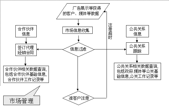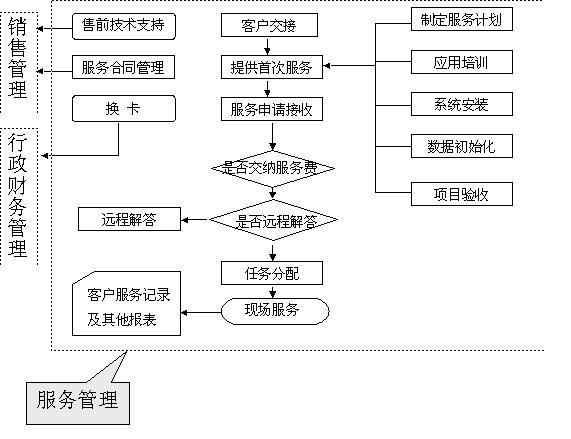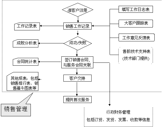 選定適合中小企業(yè)應(yīng)用的CRM軟件 ----啟利CRM ( ChineseCRM.Net ),并由啟利公司負(fù)責(zé)提供實(shí)施服務(wù)。CRM系統(tǒng)的主要模塊包括:市場(chǎng)管理、銷(xiāo)售管理、服務(wù)管理、行政管理,各模塊主要業(yè)務(wù)流程圖如下: