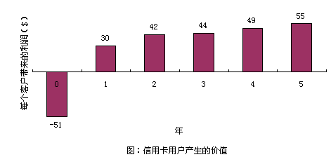 以信用卡服務為例,爭取一個新的用戶平均要51美圓,用于廣告、推銷和開戶等開支。用戶開始時花錢很少,但為公司帶來一定的利潤。但如果用戶繼續(xù)使用到第二年,就會為公司帶來更多的經濟效益,因為公司與客戶之間的信任和客戶對公司的滿意,致使客戶更多地通過信用卡消費。(圖:"信用卡用戶產生的價值")用戶貢獻在增加,公司的運作費用卻在不斷減低。信用卡公司可以不斷減少對客戶信用的審核時間。保持長期的客戶關系,還可以減少廣告支出,客戶本身就是一個免費的廣告資源。很多人在消費前喜歡聽取朋友的意見,覺得比廣告更可信。