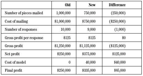 請注意,郵寄的純利潤增加了$125,000,甚至你扣除由于數(shù)據(jù)采集而產(chǎn)生的軟件、硬件即人力資源方面的$40,000,純利潤還增加了$85,000。建模的投入轉化成了200%的收益,這遠遠超過了BB&CC對這一項目的ROI要求。