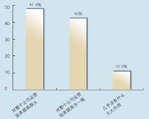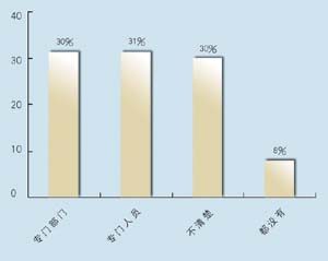 在問到實(shí)施周期上,有9家表示希望在3個(gè)月內(nèi)完成,占到47.4%,有6家接受3~6個(gè)月的周期,超過6個(gè)月的周期已經(jīng)顯得太長。在問到CRM的實(shí)施效果上,有9家認(rèn)為對(duì)公司運(yùn)營效率有很大提高,8家認(rèn)為作用一般,只有2家認(rèn)為沒有作用。表明基本上企業(yè)認(rèn)可CRM的作用。在問到是否有專門人員負(fù)責(zé)CRM時(shí),有6家表示有專門部門,有6家有專門人員,合計(jì)占62%,說明企業(yè)非常重視CRM的應(yīng)用。