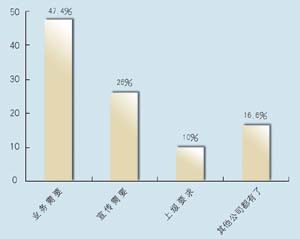 在問到對(duì)CRM的熟悉程度方面,有12家表示熟悉,占到63.2%,另有7家表示不熟悉,說明許多企業(yè)已經(jīng)對(duì)CRM有一定了解,不過也仍有相當(dāng)大的市場空間。其中有8家建立了CRM系統(tǒng),占到42%,計(jì)劃建立的有9家,占到47.4%,而有2家表示短期不會(huì)建立。從調(diào)查發(fā)現(xiàn),幾乎所有受訪者都接受和認(rèn)同CRM,盡管有一些企業(yè)還不熟悉,但在調(diào)查問卷中對(duì)此表現(xiàn)出極大的興趣。在CRM的采購動(dòng)機(jī)上,有9家表示是為了提高業(yè)務(wù),占到將近一半的比例(47.4%),而有5家表示出于企業(yè)宣傳,2家屬于上級(jí)主管部門要求,有3家表示是出于同行的示范。調(diào)查顯示,企業(yè)獲得CRM的信息來源很廣,最多的是通過報(bào)刊雜志的廣告,有6家,占31.6%,而上級(jí)推薦和供應(yīng)商推薦各有4家,各占21%,有兩家是集成商推薦,此外還有3家通過展會(huì)獲得相關(guān)信息。