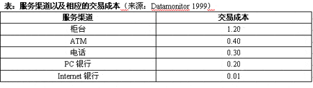 表:服務(wù)渠道以及相應(yīng)的交易成本(來源:Datamonitor 1999)